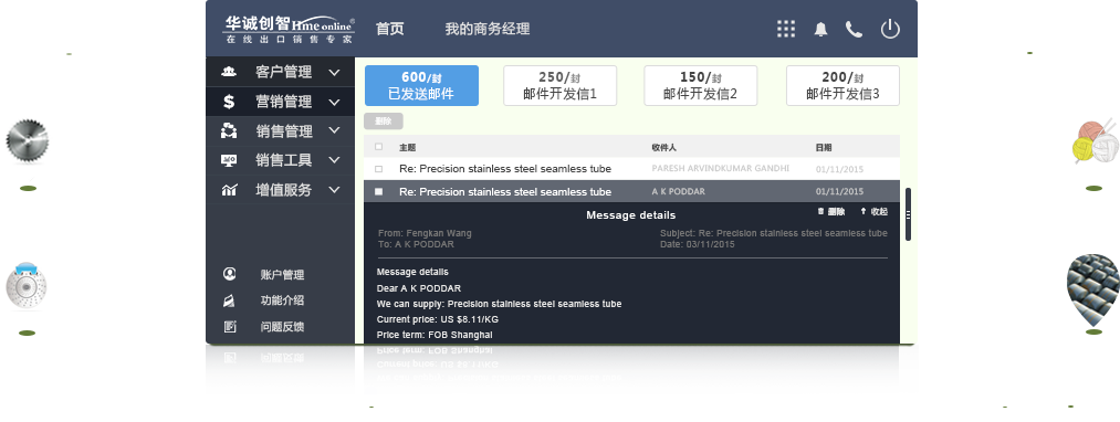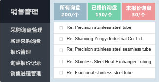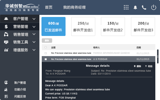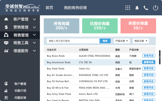 强大的销售管理功能,告别盲目销售。 精确挖掘匹配用户产品的采购询盘资源,保证客户的可开发性; 借助系统 预置报价模板,迅速将价格优势转化为销售业绩; 根据询盘进度分门别类,让您更好的把控销售进程
