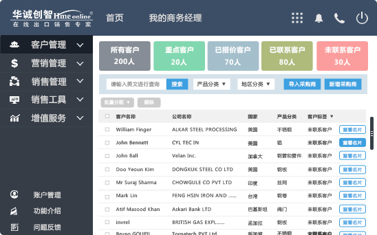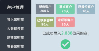 满足用户差异化分类需求,多维度筛选获取您所需的精准采购商资源;提供采购商导入功能,批量添加数据库中与您匹配的采购商。随时随地导入采购商资料,更加方便您统一管理。